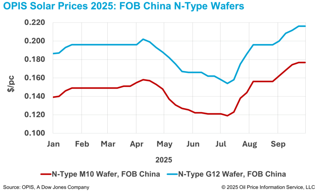 Los precios de obleas en China se mantuvieron estables esta semana, deteniendo una racha de cuatro semanas consecutivas de subidas. Según el OPIS Solar Weekly Report publicado el 30 de septiembre, los precios FOB China para las obleas tipo n M10 y G12 no mostraron cambios semanales, manteniéndose en 0,177 dólares/unidad y 0,216 dólares/unidad, respectivamente.