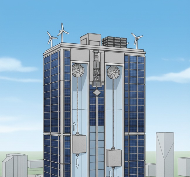 El sistema, basado en un polipasto de cuerda -un aparejo de poleas-, está diseñado para funcionar en combinación con fachadas fotovoltaicas instaladas en los muros sur, este y oeste, así como con pequeños aerogeneradores en la azotea y baterías de iones de litio (Li-ion).