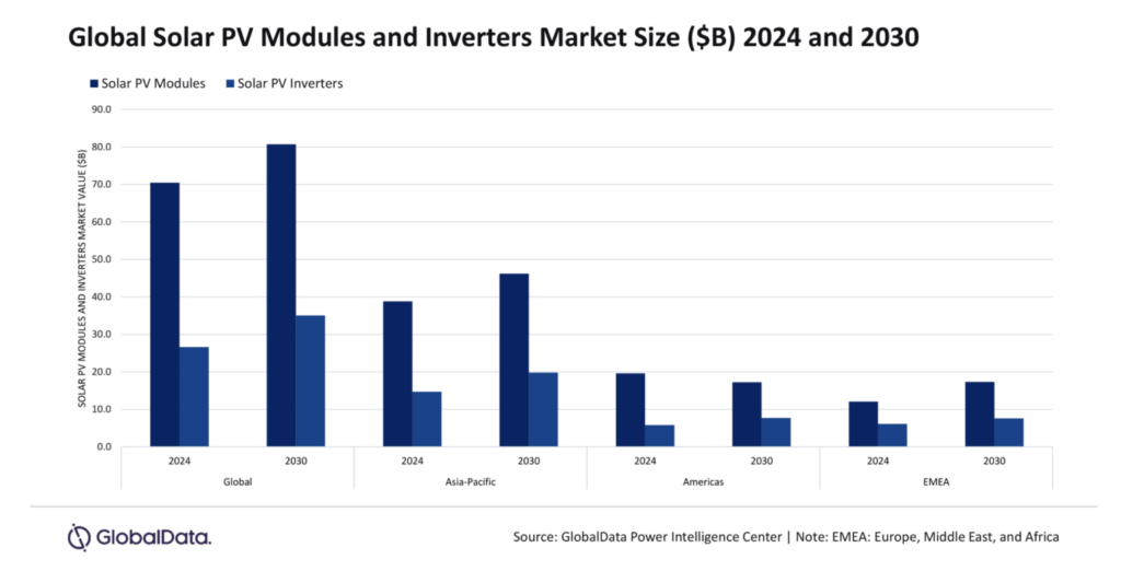 Los mercados mundiales de módulos solares e inversores están en camino de alcanzar un valor combinado de 115 800 millones de dólares en 2030, según las previsiones de la empresa británica de análisis de datos y consultoría GlobalData.