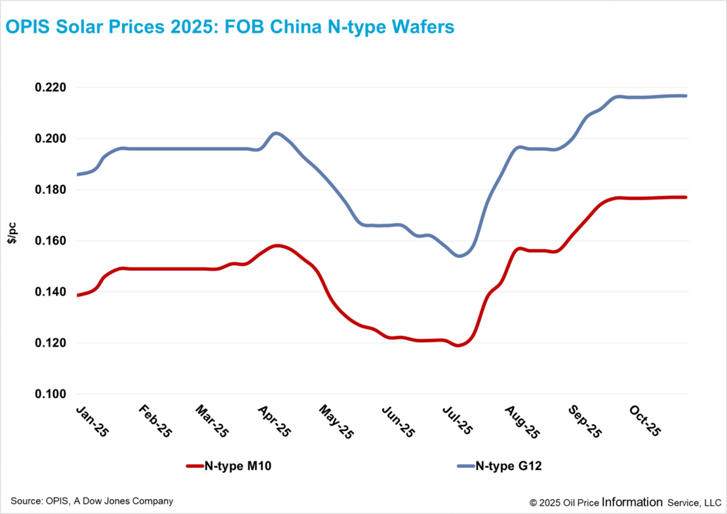 Los precios FOB China de las obleas de tipo n se mantuvieron prácticamente estables esta semana. Según el informe semanal de OPIS Solar publicado el 31 de octubre, los precios FOB China de las obleas M10 y G12 se mantuvieron sin cambios con respecto a la semana anterior, situándose en 0,177 dólares por unidad (pc) y 0,217 dólares por unidad (pc), respectivamente.