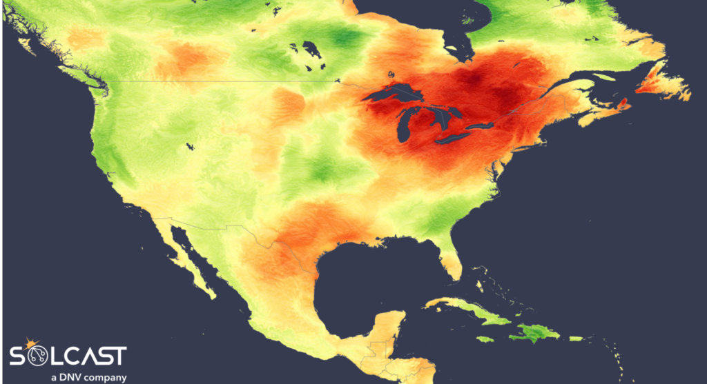 Norteamérica experimentó un rendimiento solar muy variable en octubre, ya que un fuerte sistema de alta presión aumentó la irradiación en las regiones orientales, mientras que las condiciones más frías y nubladas redujeron el potencial solar en el noroeste del Pacífico. En el Caribe, el huracán Melissa alteró significativamente los niveles de irradiación y dañó las infraestructuras. Según el análisis realizado con la API de Solcast, estos patrones climáticos regionales contrastantes dieron lugar a un mes variable para la generación solar en todo el continente.