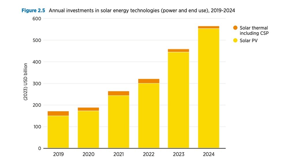 La inversión en tecnologías solares alcanzó un récord de 554 000 millones de dólares en 2024, según el informe Global Landscape of Energy Transition Finance 2025 (Panorama mundial de la financiación de la transición energética 2025) de IRENA.