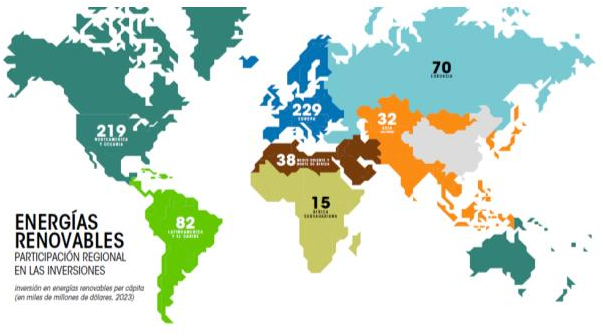 El informe puntualiza que, de acuerdo con datos de la Agencia Internacional de Energías Renovables (IRENA), la inversión en energías renovables en Latinoamérica creció un 18% en 2024, con 44.000 millones de dólares, lo que representa el 5,4% del total global destinado a este sector.