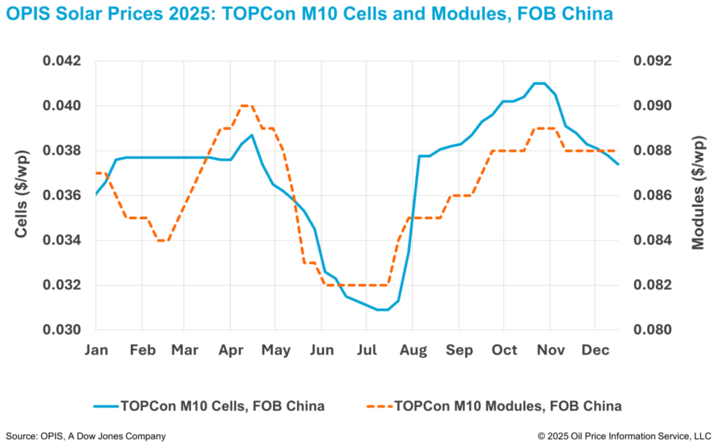 Según el informe semanal de OPIS Solar publicado el 16 de diciembre, los precios de las células TOPCon M10 FOB China se evaluaron un 1,06 % más bajos, a 0,0374 dólares/W, con indicaciones de precios entre 0,0364 y 0,0387 dólares/W.