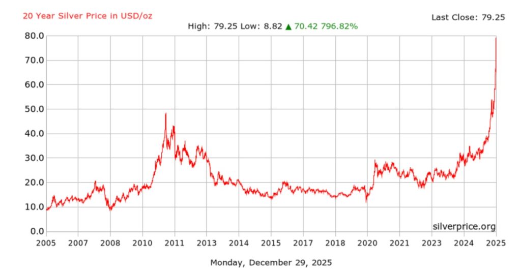 La trayectoria alcista se ha acelerado en la última semana, con el precio de la plata alcanzando los 70 dólares por primera vez en la historia el 23 de diciembre, antes de superar los 75 dólares el 26 de diciembre y superar el umbral de los 80 dólares el 28 de diciembre. Según informes de Reuters, la plata ha ganado un 181 % en lo que va de año.