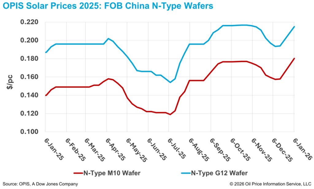 Los precios de las obleas de tipo N subieron de forma generalizada esta semana en comparación con la evaluación anterior del 16 de diciembre de 2025. Los precios FOB China de las obleas M10 de tipo n subieron un 13,92 %, hasta 0,180 dólares por unidad (pu), mientras que las obleas G12 aumentaron un 10,82 %, hasta 0,215 dólares por unidad, según el informe semanal OPIS Solar publicado el 6 de enero.