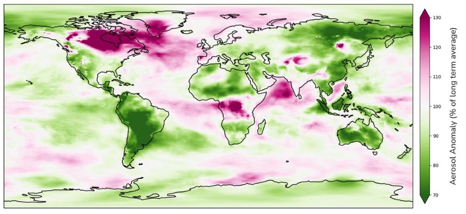 Mientras tanto, la cuenca del Congo experimentó un empeoramiento de las condiciones de los aerosoles, con anomalías de extinción entre un 20 % y un 30 % por encima de la climatología. A diferencia de las tendencias a la baja del polvo del Sáhara observadas en el norte de África, este aumento de los aerosoles se atribuye al incremento de la actividad de los incendios en las regiones de bosques húmedos. El número de incendios activos en estos bosques se ha duplicado en las últimas dos décadas, debido en gran medida a una combinación de clima más cálido y seco y factores antropogénicos como los conflictos o la deforestación impulsada por la agricultura.