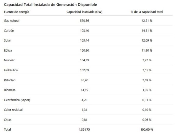 Mientras que el gas natural sigue siendo la mayor fuente individual de la capacidad total de Estados Unidos, con un 43.1 %, el carbón ha caído al 14.7 %. La energía solar ha subido al 12.6 % del total, seguida de la eólica con un 12.4 %, la nuclear con un 7.9 % y la hidroeléctrica con un 7.5 %.