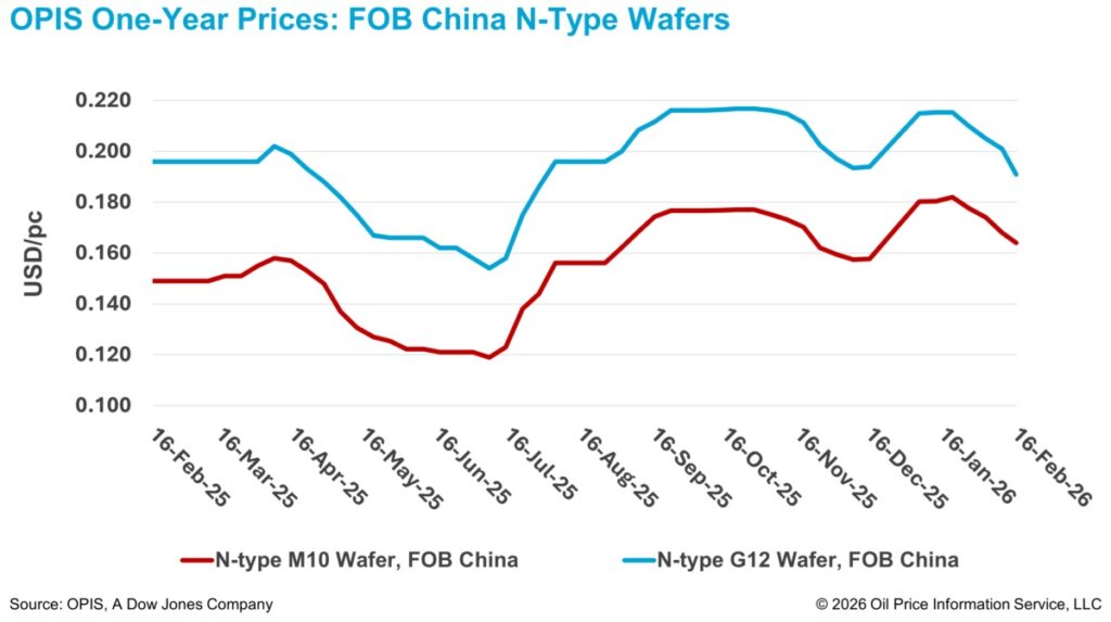 Los precios franco a bordo (FOB) en China para las obleas tipo n M10 y tipo n G12 disminuyeron un 2,38% y un 4,98% intersemanalmente, hasta los 0,164 dólares/unidad y los 0,191 dólares/unidad, respectivamente, según el Informe Global de Mercados Solares de OPIS, publicado el 16 de febrero.