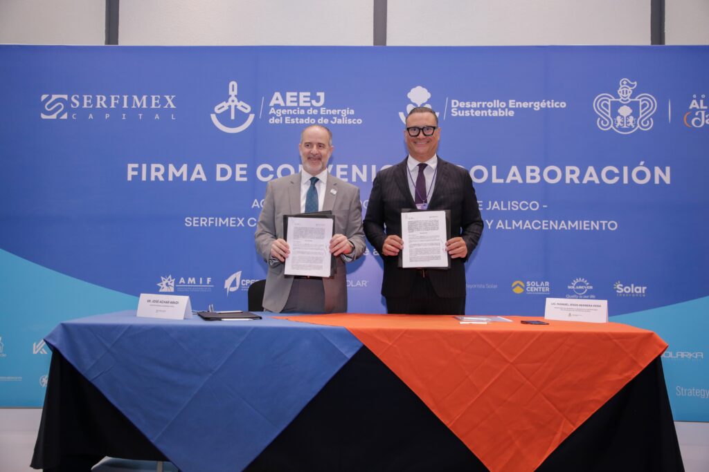 La Agencia de Energía del Estado de Jalisco y Serfimex Capital firmaron un convenio de colaboración para impulsar proyectos de energía limpia en los sectores industrial, comercial y hotelero del estado, con una meta de colocación de financiamiento de mil millones de pesos hacia 2030. El acuerdo contempla líneas dirigidas a integradores para sistemas fotovoltaicos a partir de 1 millón de pesos y hasta 0.7 MW, así como financiamiento para sistemas de almacenamiento con baterías sin límite de monto, de acuerdo con la información difundida durante la firma.