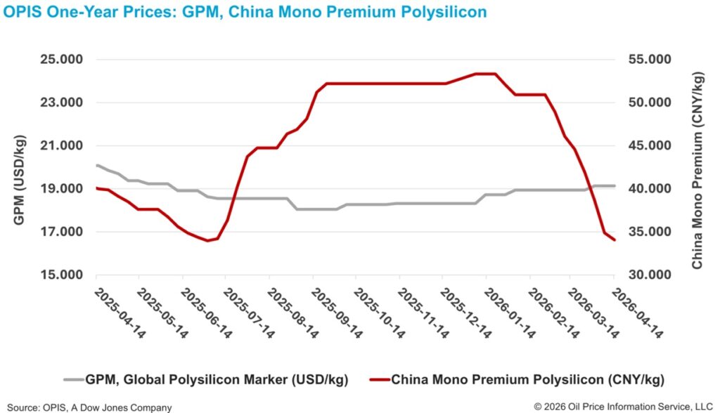 Según el informe OPIS Global Solar Markets publicado el 14 de abril, el China Mono Premium -la evaluación de OPIS para polisilicio de grado mono utilizado en la producción de lingotes tipo n- cayó un 2,36% semana a semana, hasta 34,071 yuanes chinos (4,99 dólares)/kg, o 0,072 yuanes/W.